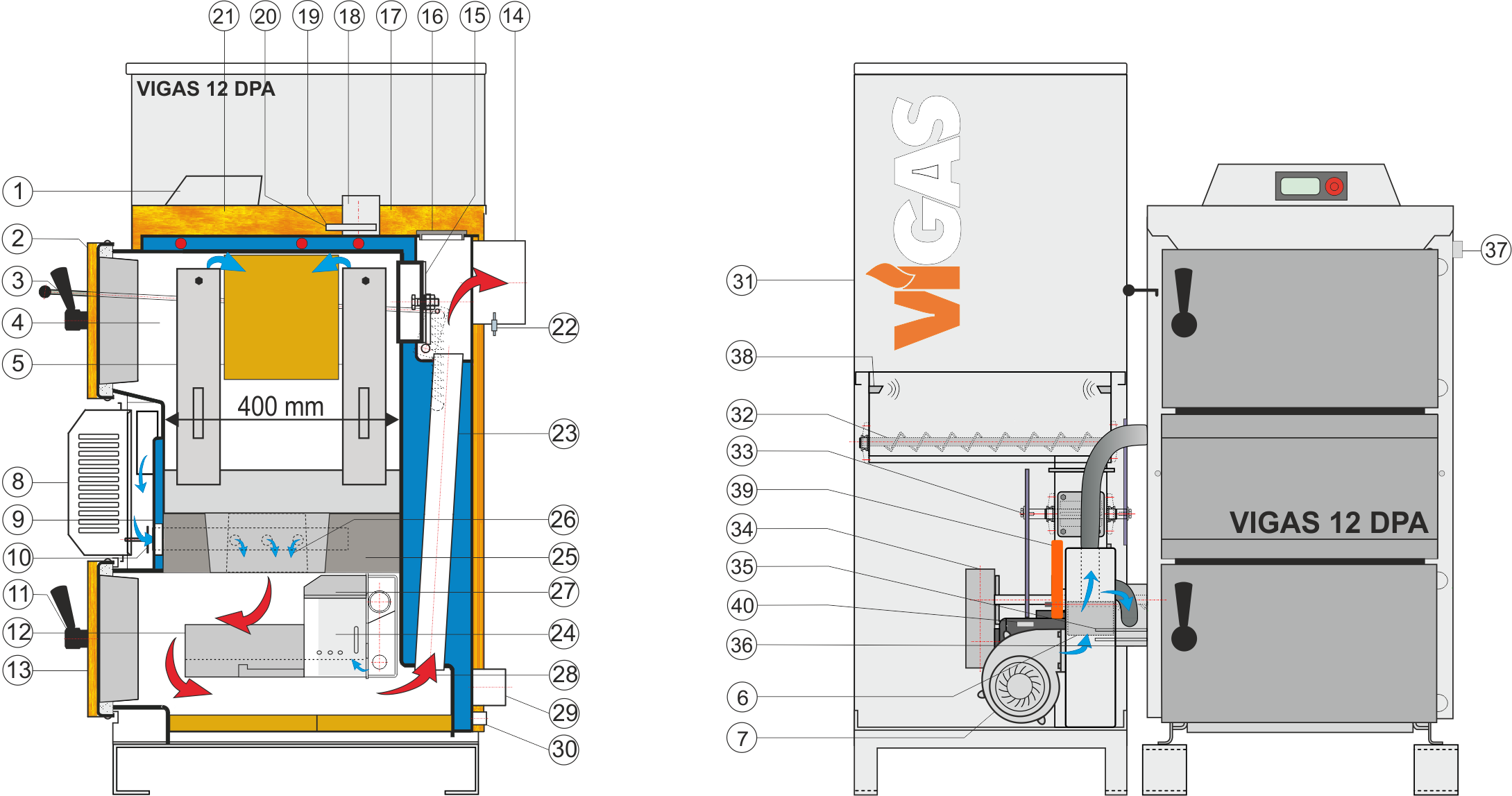 | 2. | Horné dvierka | 12. | Spaľovacia komora | 22. | Teplomer spalín | 32. | Podávací dopravník |
