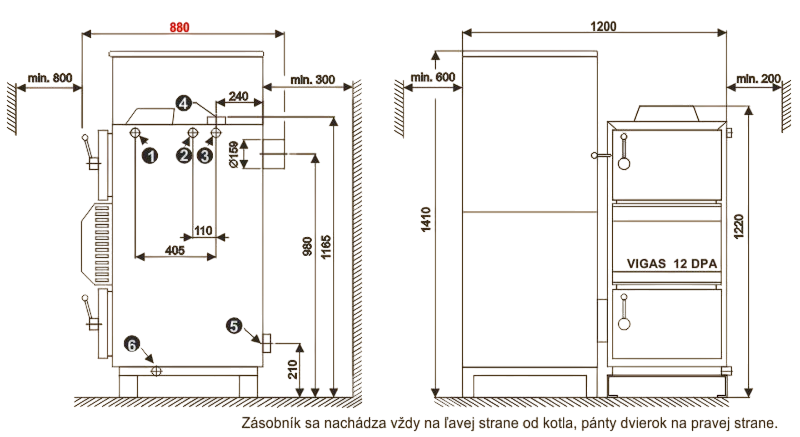 Rozmerový náčrtok a umiestnenie kotla VIGAS 12DPA