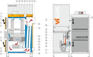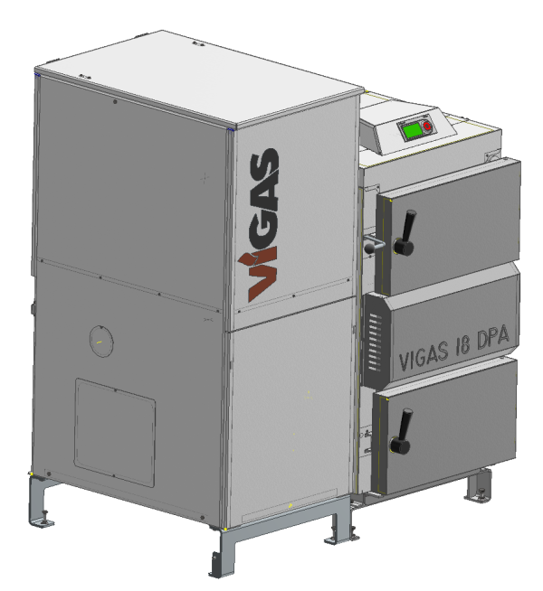 Teplovodný kotol VIGAS 26 DPA je určený pre spaľovanie peliet o priemere 6 mm a dĺžke do 40 mm a suchej drevnej hmoty od pilín po polená v dĺžke do 520 mm a maximálnom priemere 20 cm. Piliny, hobliny, štiepky a odrezky je nutné spaľovať spolu s polenami. Izoláciu kotla tvorí izolačný materiál NOBASIL hrúbky 20 a 40 mm. Spaliny sú odvádzané cez oceľové hrdlo o priemere 160 mm. Zásobník na peletky je vyhotovený z plechu hrúbky 1,5 mm a jeho objem je 340 l. Súčasťou kotla je nová čelná prevodovka, elektrická zapaľovacia špirála, dávkovací turniket, snímač komínovej teploty a ultrazvukový snímač hladiny peliet